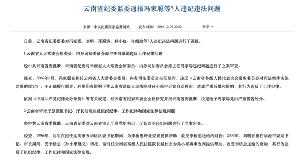 2006年,刘明在担任临沧市委副书记、市长期间,受李桥忠(孙小果继父)请托,请时任云南省高级人民法院院长赵仕杰为孙小果再审改判提供帮助,收受李桥忠送给的财物,其行为违反了组织纪律、工作纪律和国家法律法规。