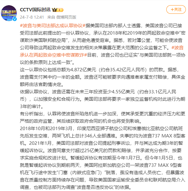 这一认罪协议包括总额为4.872亿美元(约合35.42亿元人民币)的罚款。据悉,波音需支付其中约一半的金额。波音还可能被要求向遇难者家属支付赔偿,具体金额将由法官酌情决定。