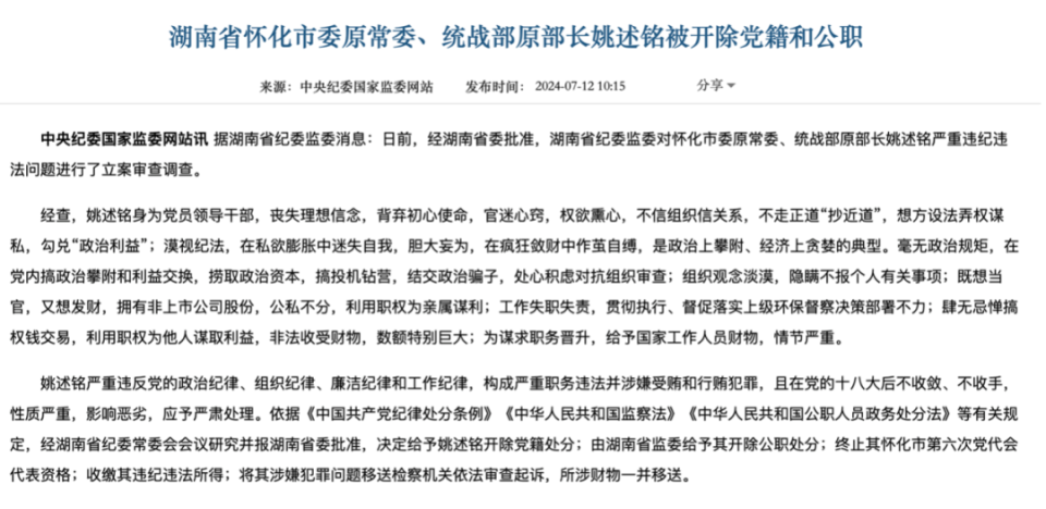 7月12日,湖南省纪委监委发布消息,怀化市委原常委、统战部原部长姚述铭被双开。