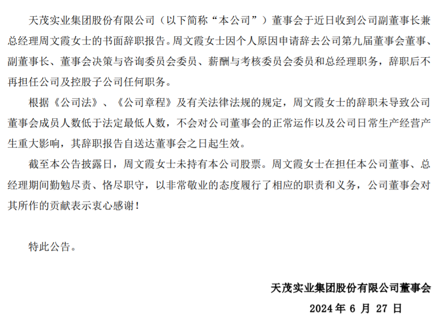 6月27日,天茂集团发布公告称近日收到公司副董事长兼总经理周文霞递交书面辞职报告。周文霞因个人原因申请辞去公司第九届董事会董事、副董事长、董事会决策与咨询委员会委员、薪酬与考核委员会委员和总经理职务,辞职后不再担任公司及控股子公司任何职务。这意味着,周文霞同步卸任国华人寿监事会主席、党委书记,以及国华人寿控股子公司国华保合健康养老产业发展有限公司董事长兼总经理。