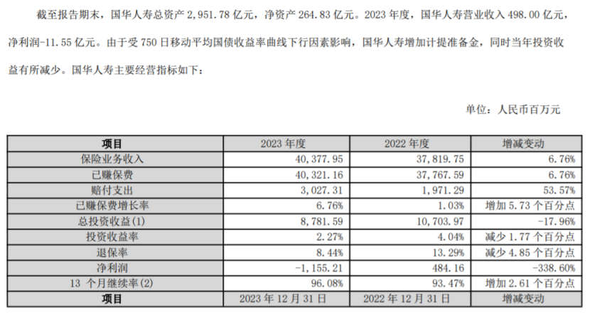 据了解,寿险公司保险责任准备金的折现率以“750日移动平均国债收益率曲线”为基准,随着“750曲线”的下行,寿险公司需要进行相应准备金的补提,进而削弱当期利润和偿付能力。而这一因素自2023年就已对国华人寿业绩产生影响:2023年,国华人寿实现营业收入498亿元,却录得净亏损11.55亿元。其中,“750曲线”下行导致国华人寿增加计提准备金,是致其亏损的因素之一。