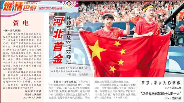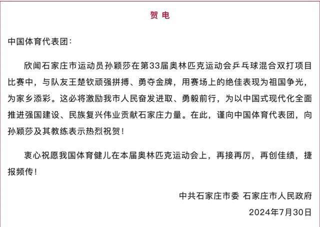 “这枚奥运金牌背后,是孙颖莎多年来刻苦训练、顽强拼搏的结果,也充分展现了石家庄籍运动员自强不息、勇争第一的精神风貌。”