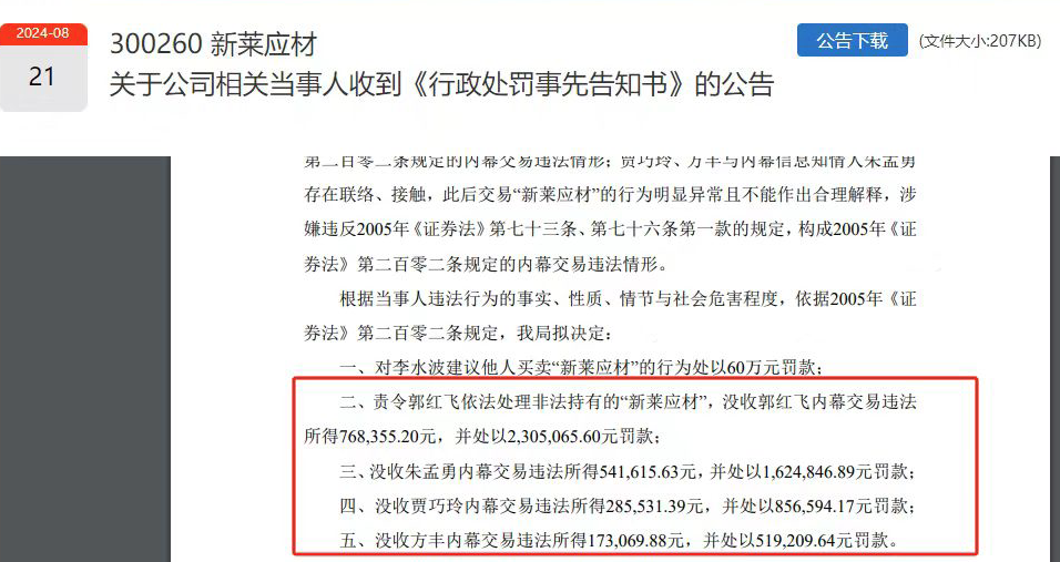 内幕交易?“没一罚三”!新莱应材(300260)包括控股股东、实际控制人李水波在内的多名高管、员工,或将面临证监会合计超760万元的处罚。
