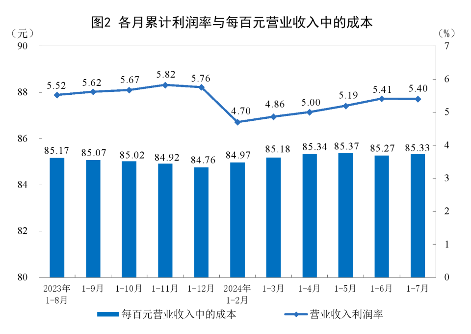1—7月份,规模以上工业企业每百元营业收入中的成本为85.33元,同比增加0.09元;每百元营业收入中的费用为8.41元,同比持平。