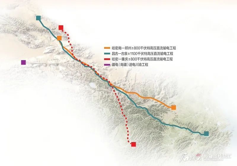 第二通道:昌吉—古泉±1100千伏特高压直流输电工程。2019年9月投运。线路经新疆、甘肃、宁夏、陕西、河南、安徽6省区,全长3293千米。