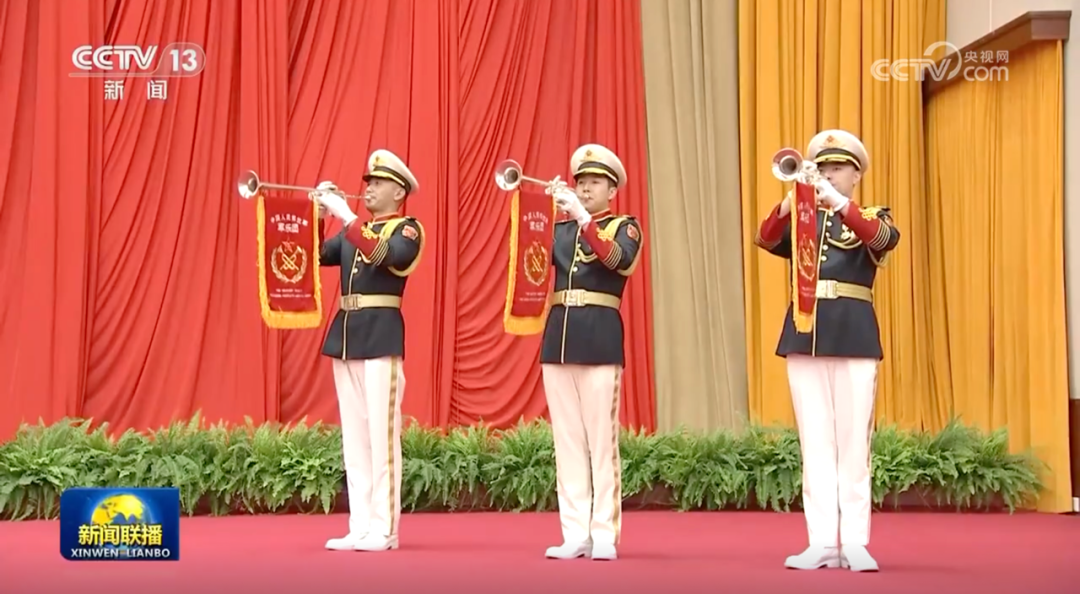 与去年相比,今年的国庆招待会还有一个变化,即新增了三位号角手。在嘹亮的号角声中,习近平走上主席台,发表重要讲话。