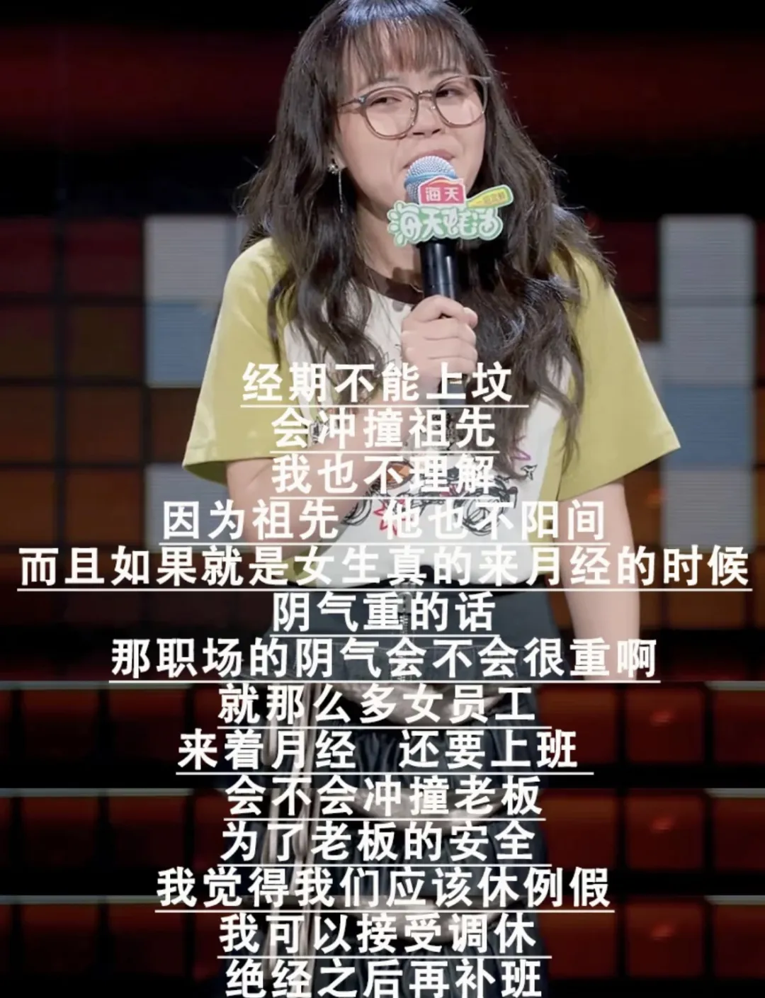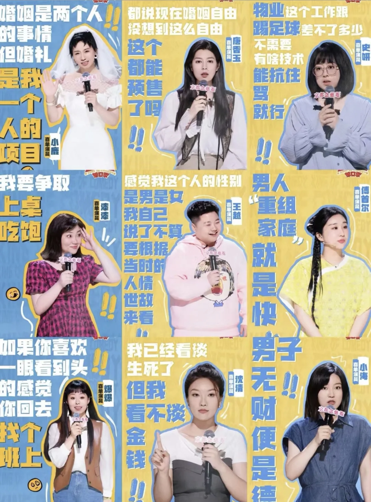 这其中有熟面孔杨笠、小鹿、晓卉、步惊云、唐香玉、颜怡颜悦,也有山河、史妍、Echo、菜菜、张慧、鸭绒、漆漆等在荧屏横空出世的新面孔。许多观众对她们的金句印象深刻:唐香玉犀利吐槽“婆家会笑话”是纯纯催婚PUA话术,张慧怒怼性别双标、质问怎么没人夸强势女人“好woman”;“东北慢性子”史妍分享中年感悟,为啥老公爱蹲厕所,“那里到底有谁?”;漆漆与大码身材和解,分享“恋爱脑”经历。