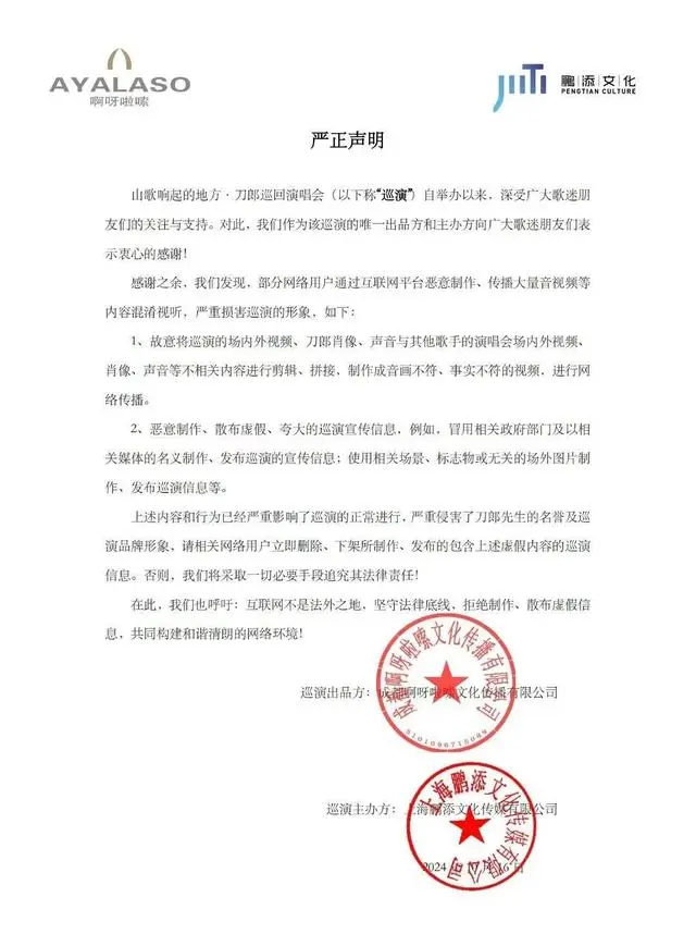10月16日,刀郎巡回演唱会的出品方和主办方联合发出严正声明,表示有部分网络用户通过互联网平台恶意制作、传播大量音视频等内容混淆视听,严重损害巡演的形象:
