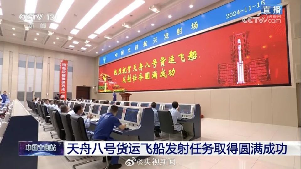 据中国载人航天工程办公室消息,北京时间2024年11月15日23时13分,搭载天舟八号货运飞船的长征七号遥九运载火箭,在我国文昌航天发射场点火发射,约10分钟后,天舟八号货运飞船与火箭成功分离并进入预定轨道,之后飞船太阳能帆板顺利展开,发射取得圆满成功。后续,天舟八号货运飞船将与在轨运行的空间站组合体进行交会对接。