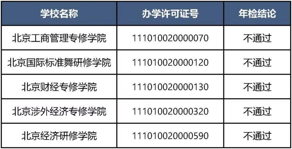 另有5所民办非学历高等教育机构的年检结论为“不通过”,暂停招生活动。分别为北京工商管理专修学院、北京国际标准舞研修学院、北京财经专修学院、北京涉外经济专修学院、北京经济研修学院。