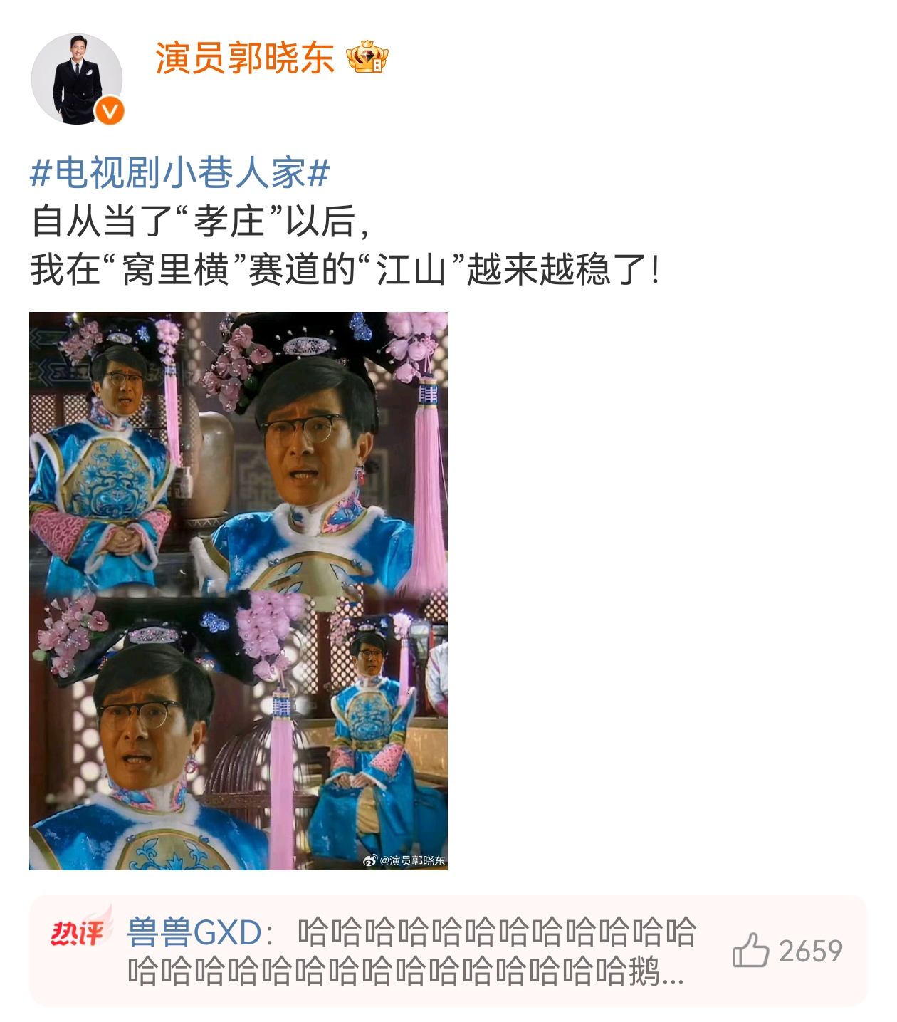 角色不讨喜,但郭晓东坦然接受,在微博领取“孝庄”的称号,还下场做了表情包,调侃自己在“窝里横”赛道的“江山”越来越稳:“这是对我演技的认可。” “庄超英的一些行为,引起观众很多不适,所以会出现大家对庄超英这个人物的一种泄愤情绪,我觉得这是对我这个人物的一种认可,我觉得是挺好的一件事情。”他告诉记者,“表情包是我自己做的。我第一次听到这个‘孝庄’的时候,觉得确实有意思。第一个想出这个称号的人真是太了不起了,我的太太程莉莎曾演过‘秘史’系列,所以更具意义了。”