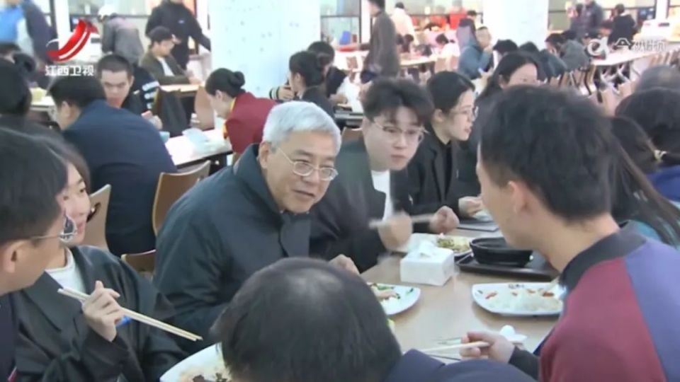 尹弘走进教学楼,和学生一起听思政课;在大学生活动中心给师生代表作了形势与政策报告;报告会结束后,他还走进学生食堂,一起打菜用餐。
