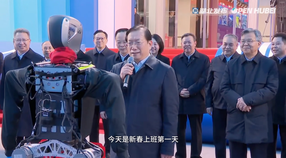 据“湖北发布”报道,2月5日,在湖北“新春第一会”开始之前,10款“湖北造”人形机器人在武汉洪山礼堂组团“开工”,湖北省委书记王忠林、省长李殿勋分别与名为“天问”的人形机器人互动。