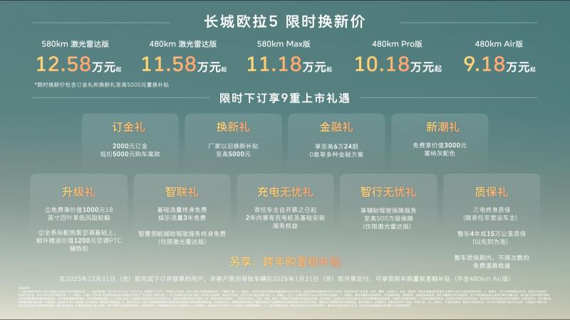 2025年12月16日——今日,长城汽车欧拉品牌全新A级纯电SUV——长城欧拉5正式上市。新车共推出5款配置,建议零售价区间为 9.98万至13.38万元,限时换新价9.18万元起(限时换新价包含“订金礼”和“换新礼”至高5000元以旧换新补贴)。为回馈广大用户的热爱与支持,即日起至2025年12月31日,用户下订并锁单即可尊享包含订金礼、换新礼、智行无忧礼在内的9重上市好礼,以及跨年购置税补贴(不含480km Air版)等丰厚购车权益。凭借诚意十足的价格权益与越级产品力,长城欧拉5致力于成为全球年轻用户的“严选搭子”。
