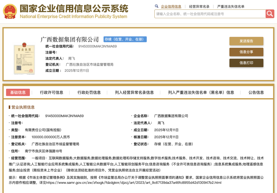 据介绍,该集团由自治区国资委、广西投资集团、广西国控资本运营集团、广西北部湾投资集团共同出资组建,于2025年12月11日完成工商注册。