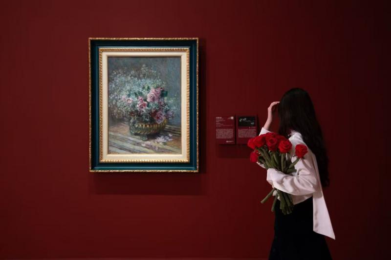 而在馆内,三幅莫奈真迹集中亮相,成为连接自然与艺术的关键枢纽。《台阶》以丰富明亮的色彩定格了秋日维特伊古老农场庭院的自然瞬间,再现光线在植被上的斑驳变化;《盆中花(玫瑰与满天星)》则将“外光技法”应用于室内花卉创作,以朦胧光影捕捉粉色玫瑰的生机与动势。正如莫奈所言“我能成为画家,也许要归功于花”,观众在植物园中漫步的鲜活色彩,正是对这幅传世名作最生动的现实转译。