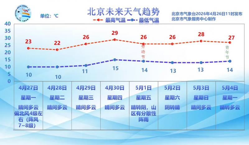 受冷空气影响,今天(4月26日)早晨到中午前后阵风较大,午后开始风力减弱,最高气温较昨日小幅回落,体感较为舒适。夜间云量较多,西部、北部有分散性阵雨,阵风5级左右,凉意明显,早晚出行请添加外套。