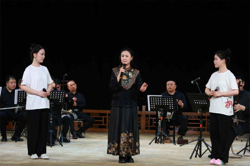 随后,不仅《远去的白马》进行了片段呈现,乐队也首次走到台前,由主奏员刘琦、杨涛、王飞与乐队同仁一起演奏的《曲牌联奏》,将河北梆子经典曲牌次第流转,明快激昂的节奏层层递进、韵味深厚。返场演奏的《夜深沉》也在瞬间再次点燃全场气氛。王洪玲、安凤英两位艺术家更是现场点评,帮助观众在欣赏之余,更读懂戏曲艺术的根与魂。最后,青年演员王思佳的《大登殿》、吕子烨的《南北和》选段、康佳乐的《洪湖赤卫队》选段及王洪玲携王思佳、康佳乐共同演唱的《杜十娘》选段为开放日收官。