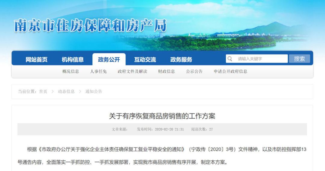 2月20日,南京市住房保障和房产局发布关于有序恢复商品房销售的工作方案。方案指出商品房销售实行精准防,符合条件的各开发企业项目售楼处逐步有序开放。