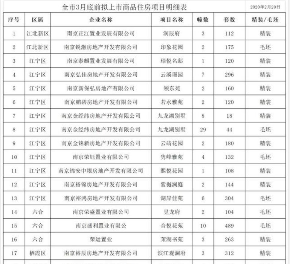 南京市3月底前拟上市商品住房项目明细表(部分)2月20日,南京市住房保障和房产局发布关于有序恢复商品房销售的工作方案。方案指出商品房销售实行精准防,符合条件的各开发企业项目售楼处逐步有序开放。