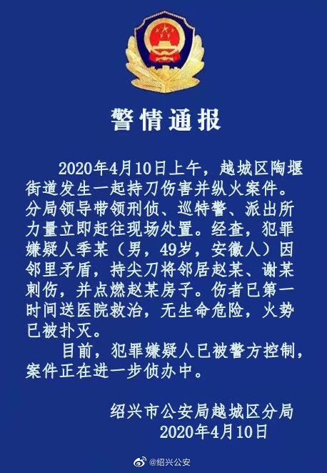 绍兴发生一起持刀伤人并纵火案 犯罪嫌疑人被控制