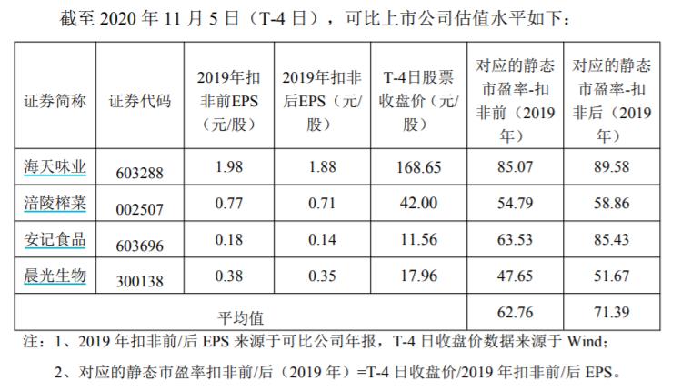 公告显示,截至2020年11月5日,海天味业、涪陵榨菜、安记食品、晨光生物对应的2019年扣非后静态市盈率分别为89.58倍、58.86倍、85.43倍、51.67倍。
