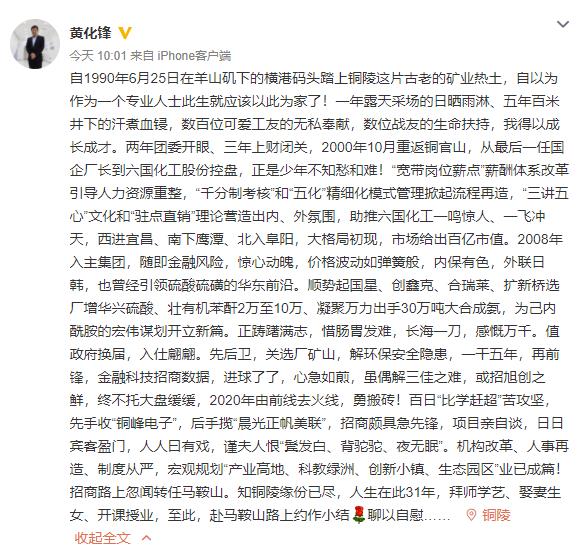 4月1日上午10时许,安徽铜陵市委常委、铜陵经开区党工委书记黄化锋在其实名认证微博上发文称,“招商路上忽闻转任马鞍山。知铜陵缘份已尽,人生在此31年,拜师学艺、娶妻生女、开课授业,至此,赴马鞍山路上约作小结,聊以自慰。”