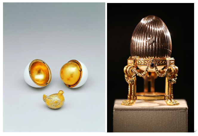 俄国皇室第一枚皇室彩蛋(左)和第三枚皇室彩蛋,由Fabergé费伯奇制作