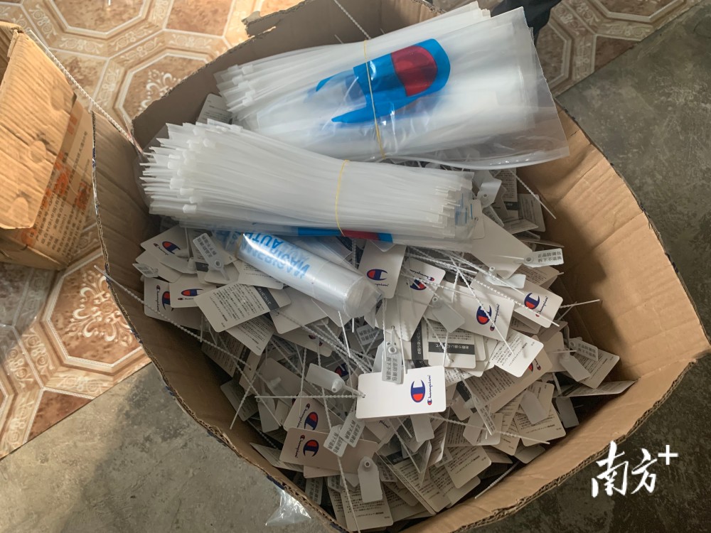 一间堆满待寄的衣物普通仓库,内部却另有乾坤,7月19日,揭阳市公安局环食药侦支队联合揭东分局对揭东区新亨镇坪埔村书斋围东座一无名仓库进行突击检查,抓获嫌疑人钟某珊(女,30岁)、黄某华(女,23岁)、钟某杰(男,32岁)、倪某鑫(男,25岁,均系揭东区新亨镇人)4名,查扣假冒注册商标“Champion/冠军”“Dickies/帝客”等系列商品共22390件及商标标识一批,涉案金额约130万元。