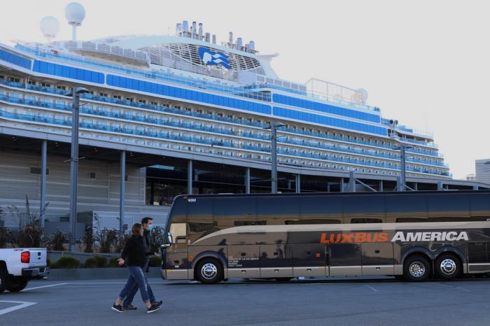 10月11日,“盛世公主”号邮轮停泊在美国旧金山港。当日,旧金山港因疫情停止邮轮营运19个月后迎来首艘复航邮轮“盛世公主”号。