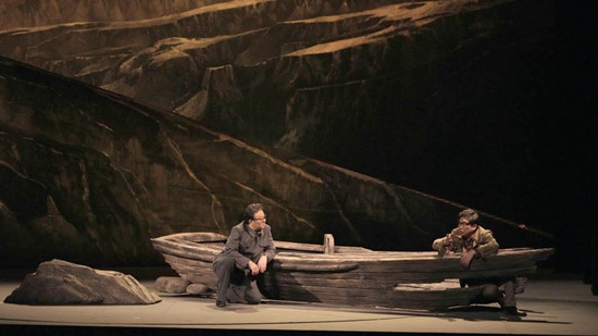 话剧《路遥》是与路遥惺惺相惜的“路遥们”为他献上的一首挽歌,这其中有诗意,有敬意,也有一份清晰的自我指认。通过全息投影和多媒体技术呈现奔腾不息的黄河浪涛、气势磅礴的黄土高原、摧枯拉朽的漫天狂风,以自然环境来象征人物艰难的生命历程和澎湃的生命激情,以不断重复的黄河纤夫近乎匍匐地拖拽前行作为人物生命姿态和创作追求的意象表达,并在结尾处由路遥亲自拉纤而强化这一意象,配合着深沉恢弘的音乐,这种高情感浓度的呈现饱含着创作者对路遥在逆境与挣扎中顽强奋斗与自我献祭精神的高度礼赞,也表达了一份深深的理解与认同。