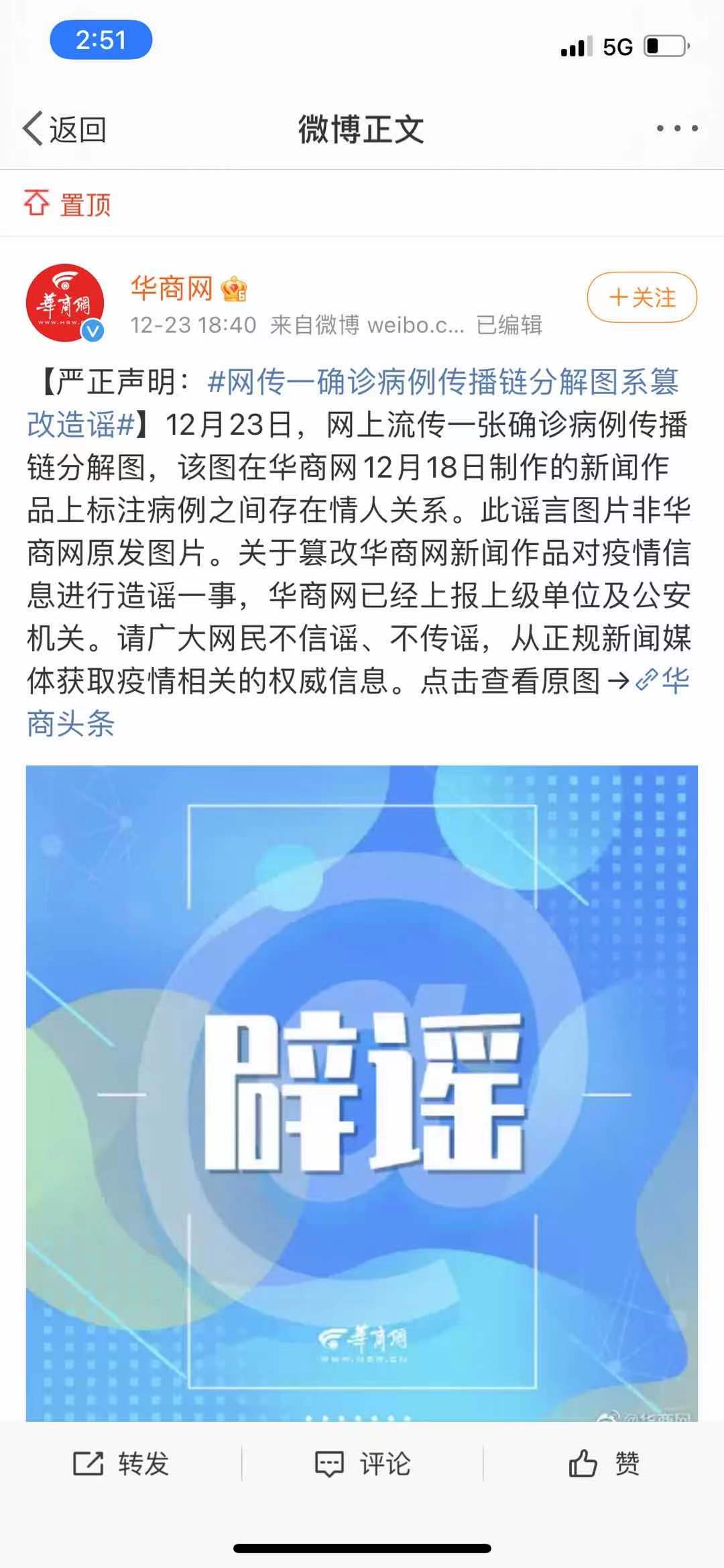 12月23日,华商网通过其官方微博辟谣称,网上流传一张确诊病例传播链分解图,该图在华商网12月18日制作的新闻作品上标注病例之间存在情人关系。此谣言图片非华商网原发图片。关于篡改华商网新闻作品对疫情信息进行造谣一事,华商网已经上报上级单位及公安机关。请广大网民不信谣、不传谣,从正规新闻媒体获取疫情相关的权威信息。
