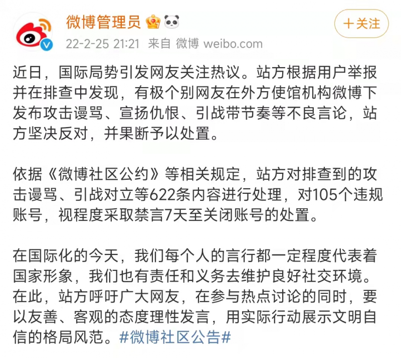 @微博管理员 25日21时发布消息称,站方对排查到的攻击谩骂、引战对立等622条内容进行处理,对105个违规账号,视程度采取禁言7天至关闭账号的处置。