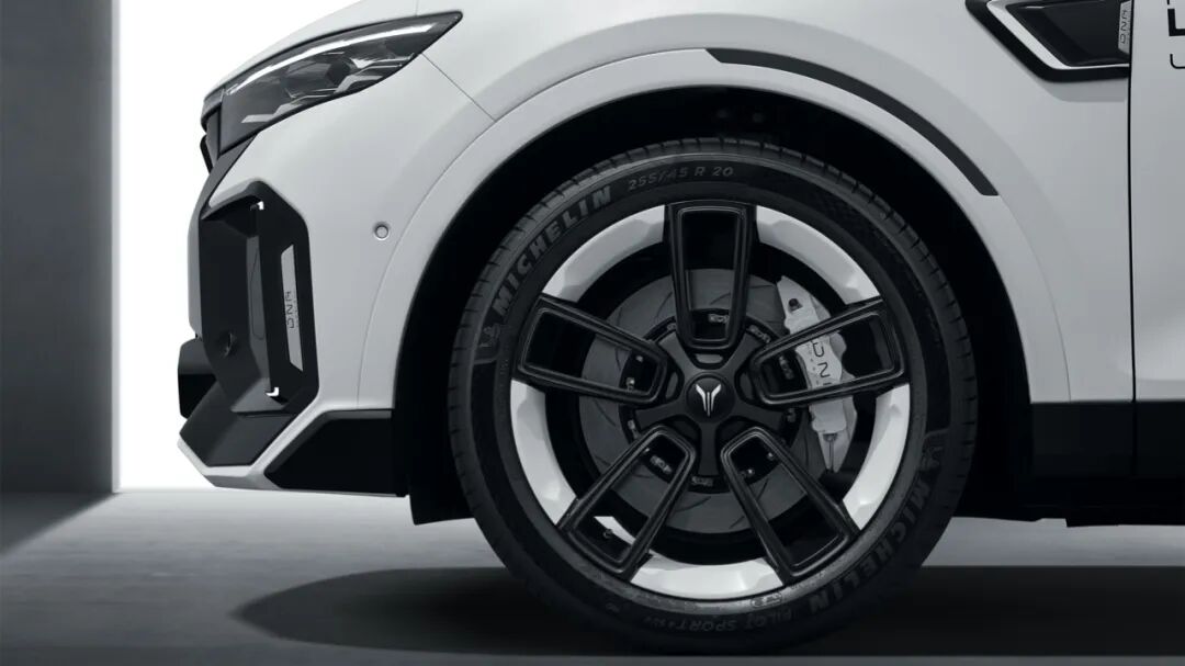 四个轮子异色设计非常独特,采用哑光色与亮色拼色镂空锻造轮毂,后轮采用独特的轮拱罩设计,具备强烈的视觉冲击,标配米其林高性能运动轮胎,以及100mm自适应高低可调空气悬架。