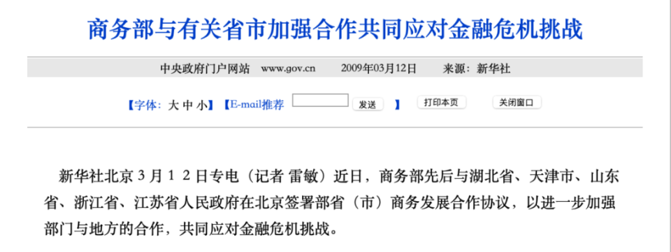 2011年,国际商报发表了《部省合作渐入蜜月期》一文。文中提到,商务部与多个省份签署了部省合作协议。并称,这一应对金融危机的“应急” 之举,已经向实施区域经济政策的“抓手”角色转化。