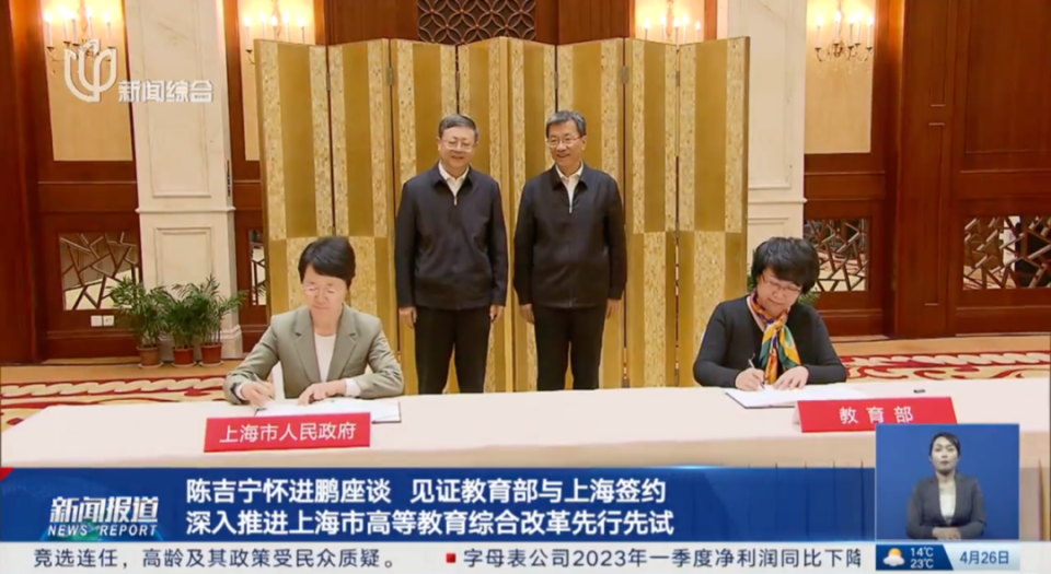 4月25日,在上海,教育部与上海市政府签署深入推进上海市高等教育综合改革先行先试战略合作协议(2023—2025年)。上海市委书记陈吉宁与教育部党组书记、部长怀进鹏举行座谈并共同见证签约。