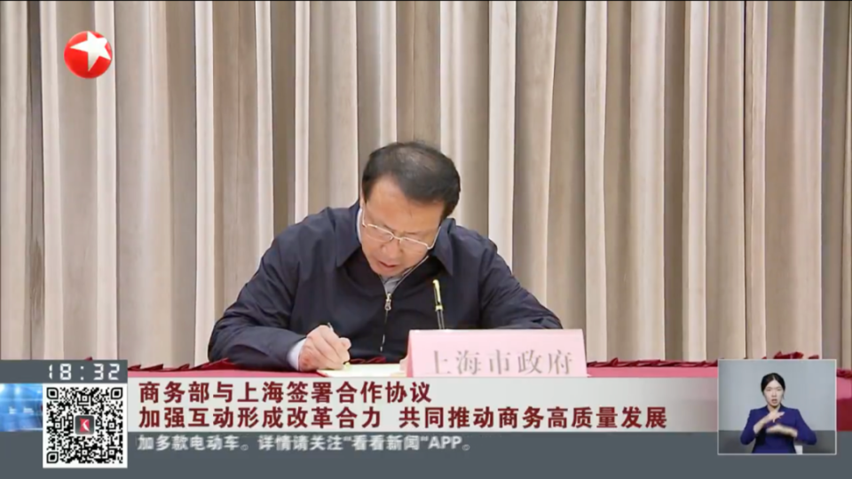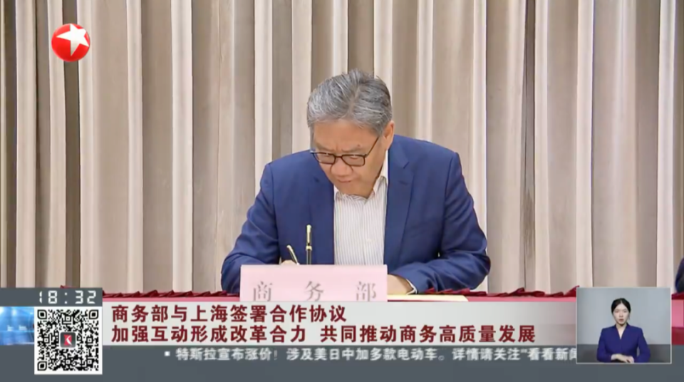 当天,在上海,商务部与上海市人民政府签署了共同推动商务高质量发展部市合作协议。