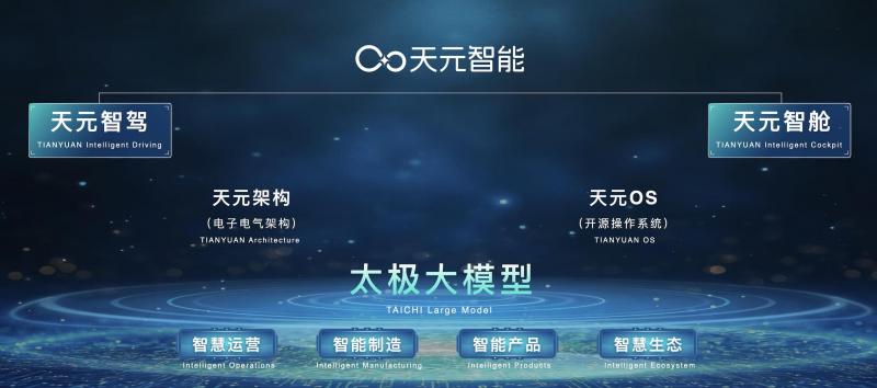 在智能化领域,“天元智能”技术体系与“太极大模型”持续演进,构建起“一核双基双元”的技术格局。“太极大模型”成为智能座舱与智驾的核心中枢,让汽车从功能载体走向智能伙伴。