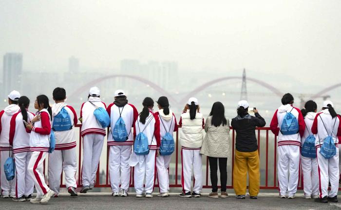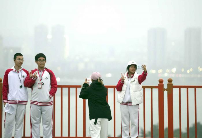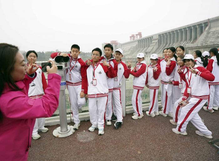学子们在丹江口大坝打卡拍照。