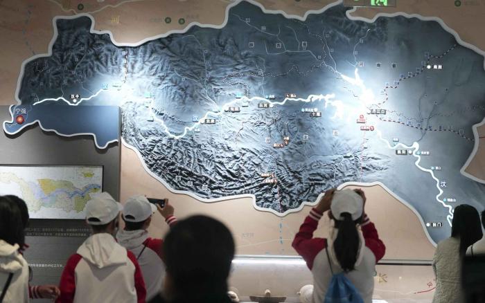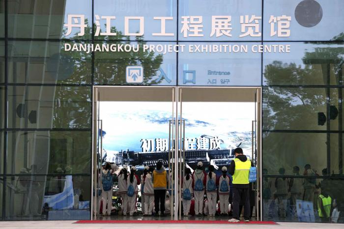 学子们在丹江口工程展览馆里参观。