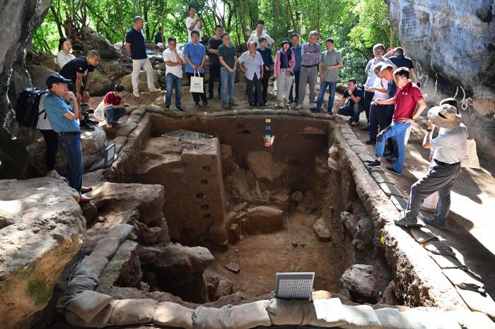 11月8日,考古专家在三亚落笔洞遗址观察发掘现场。
