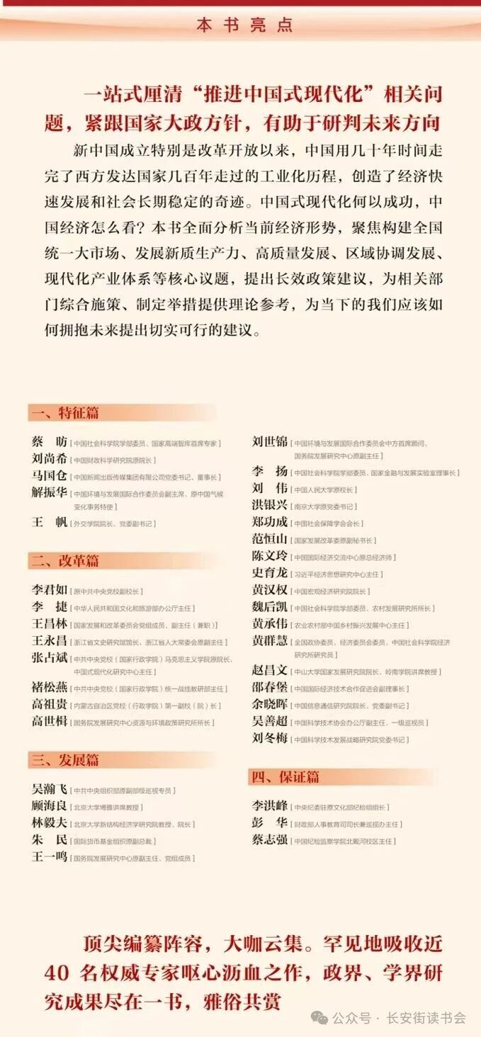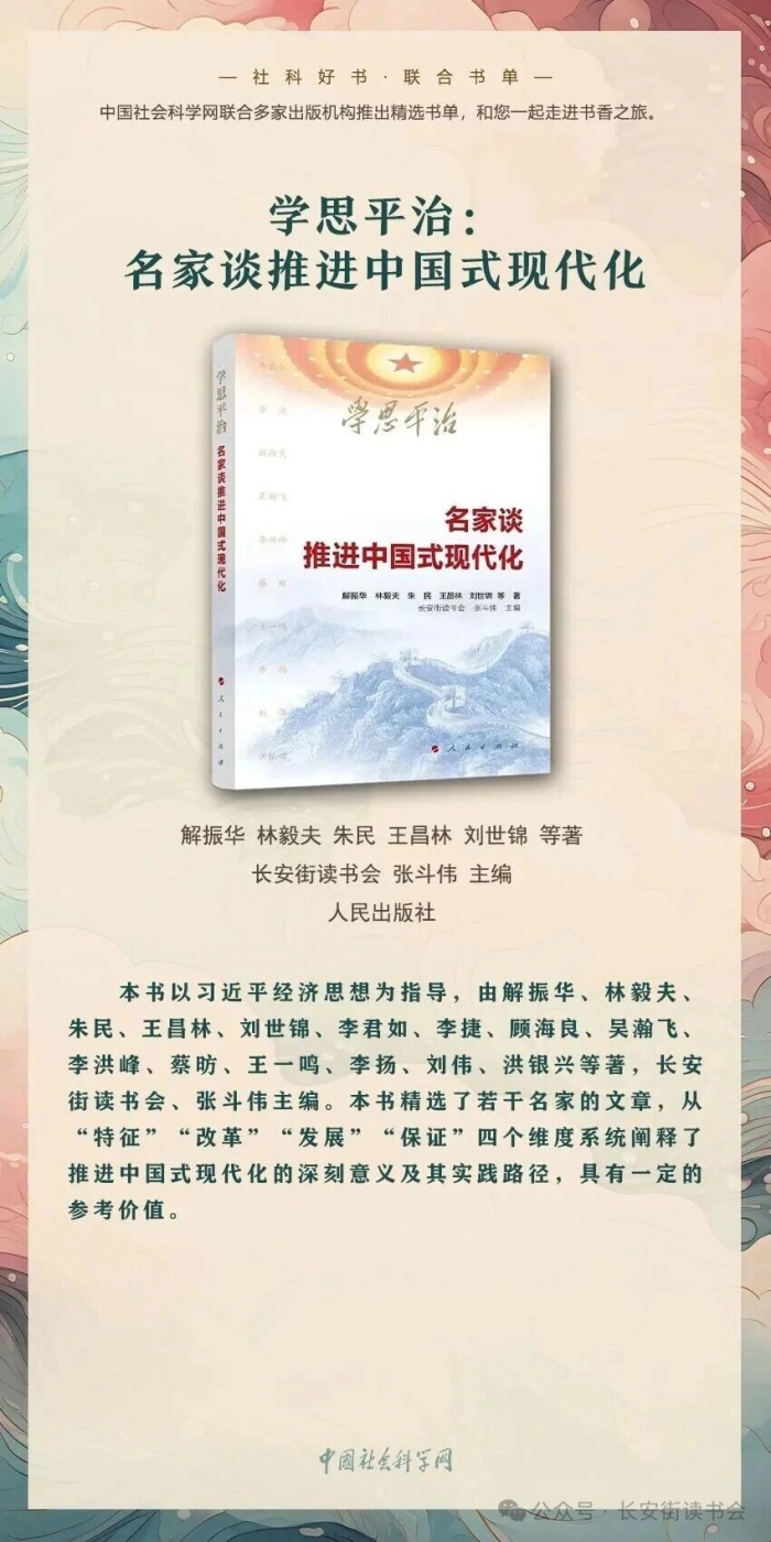 为深入学习贯彻党的二十届四中全会精神,学好用好习近平经济思想,读懂“十五五”、推进中国式现代化。由解振华、林毅夫、朱民、王昌林、刘世锦、李君如、李捷、顾海良、吴瀚飞、李洪峰、蔡昉、王一鸣、李扬、刘伟、洪银兴等著,长安街读书会、张斗伟主编的《学思平治——名家谈推进中国式现代化》一书,近日由人民出版社出版发行。本书精选了若干名家的文章,紧扣高质量发展首要任务,围绕新质生产力、现代化产业体系、科技金融、人口高质量发展等重要议题,以调研报告、改革方案和试点经验为据,从特征、改革、发展、保证四个维度系统阐释了推进中国式现代化的若干重大理论问题,具有一定的参考价值。该书第一编“特征篇”由蔡昉、刘尚希、马国仓、解振华、王帆编著,第二编“改革篇”由李君如、李捷、王昌林、王永昌、张占斌、褚松燕、高祖贵、高世楫编著,第三编“发展篇”由吴瀚飞、顾海良、林毅夫、朱民、王一鸣、刘世锦、李扬、刘伟、洪银兴、郑功成、范恒山、陈文玲、史育龙、黄汉权、魏后凯、黄承伟、黄群慧、赵昌文、邵春堡、余晓晖、吴善超、刘冬梅编著,第四编“保证篇”由李洪峰、彭华、蔡志强等编著。