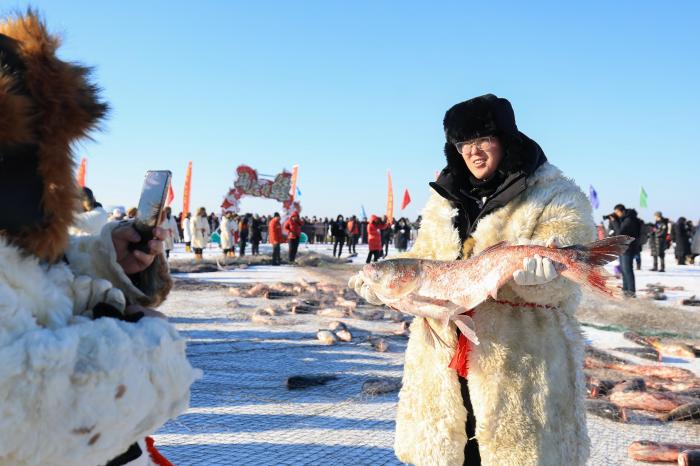 依托154万亩可养鱼水面的资源优势,杜尔伯特蒙古族自治县持续举办冬捕节、国际垂钓大赛等活动,每年因水、因鱼前来旅游的人数达数百万人次,渔文旅融合发展的模式,不仅带动了文旅市场,更拓宽了渔民的增收渠道。12月27日,捕鱼人在出鱼现场拍照。新华社发(徐率摄)