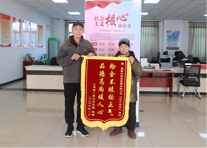 近日,密云区巨各庄镇蔡家洼村村民李山清,将一面印着“拾金不昧扬正气 品德高尚暖人心”的锦旗,送到村物业管理有限公司垃圾分类员杨剑手中。今年1月底,杨剑在整理居民丢弃的废旧衣物时,意外发现一笔“巨款”,她毫不犹豫上报物业并归还失主家属。