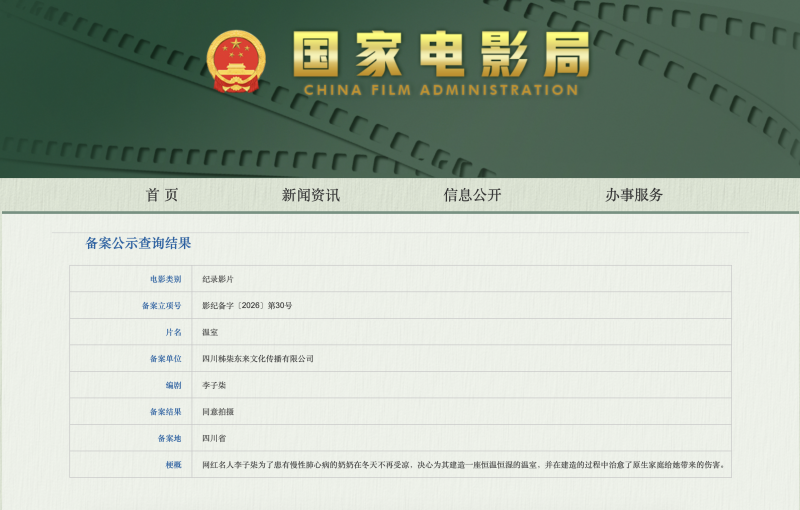 3月31日,国家电影局发布《关于2026年2月下全国电影剧本(梗概)备案、立项公示的通知》显示,由李子柒编剧的电影《温室》已备案,类别为纪录影片,备案单位为四川秭柒东来文化传播有限公司。