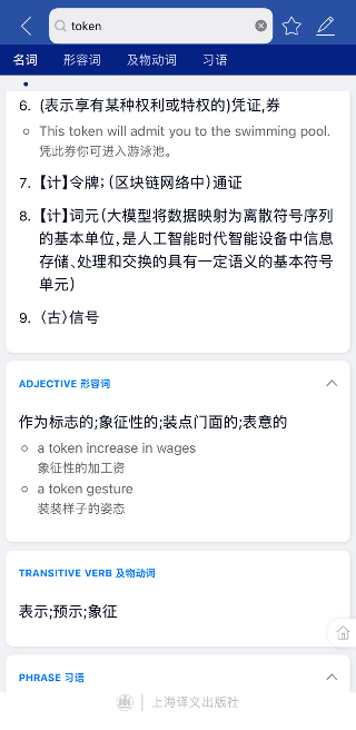 APP中则更新为:令牌;(区块链网络中)通证”;词元(大模型将数据映射为离散符号序列的基本单位,是人工智能时代智能设备中信息存储、处理和交换的具有一定语义的基本符号单元)”