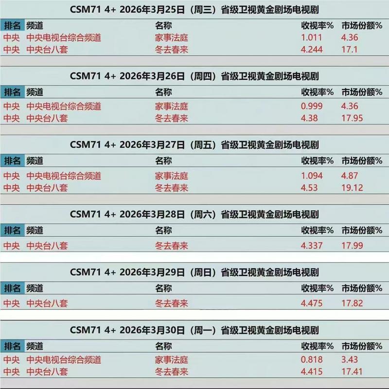 开播当天,该剧凭借中国视听大数据(CVB)2.280%的收视率获得同时段收视冠军,创下CCTV-8历史首日最高收视率。实时收视率开播七分钟破2,半个小时破3,成为2026年CCTV-8收视率最快破三的剧集。此后,收视热度更是一路走高,中国广视索福瑞(CSM)35城电视剧收视数据中,该剧登上黄金档收视率TOP1;中国广视索福瑞(CSM)71城电视剧收视数据中,该剧收视率峰值达到4.53%,市场份额高达19.12%,连续8天登顶冠军。酷云数娱黄金时段全频道排名蝉联三天TOP1,欢网全国网主要时段及黄金时段全部剧集收视率连续六天均位居TOP1,猫眼全网收视榜日榜连续六天TOP1,获得市场认可。