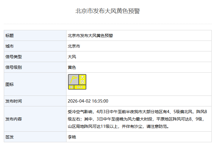 北京发布大风黄色预警