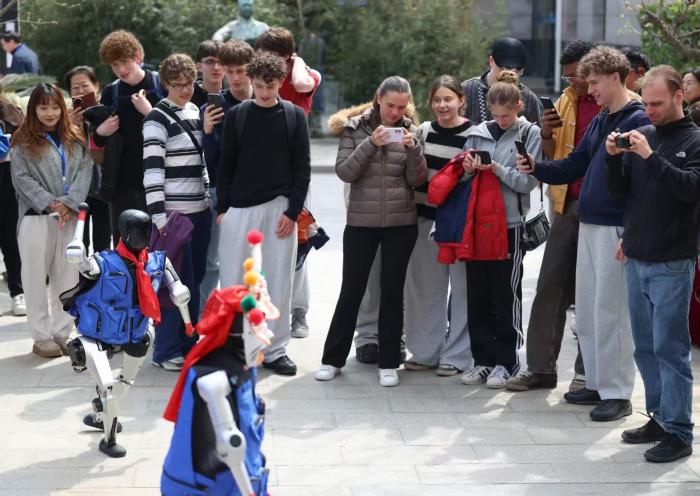 外国友好学校的师生观看机器人表演。