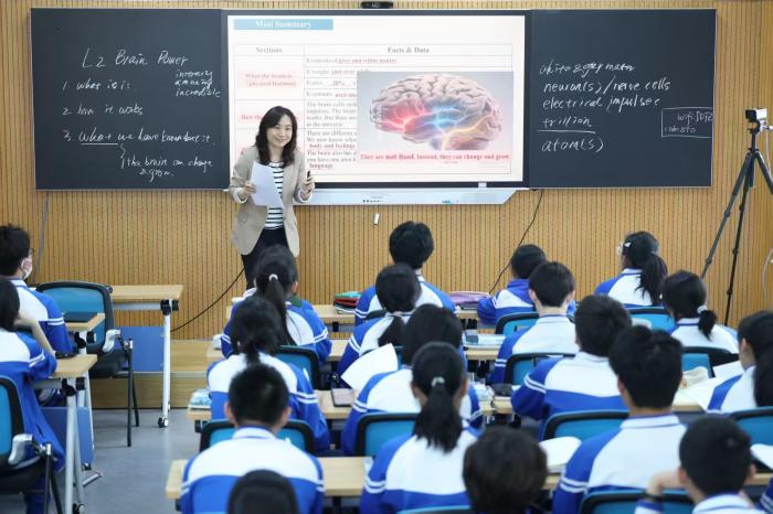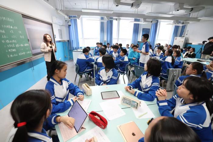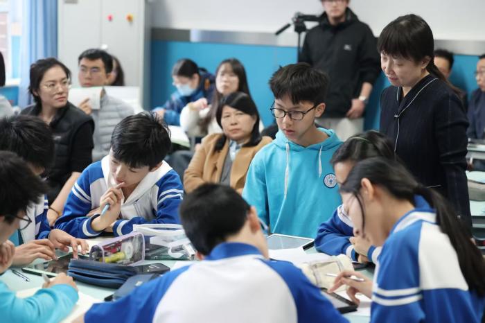 活动中,交大附中的7位教师带来AI赋能学科教学示范课,覆盖语文、数学、英语、物理、科学、体育、国际项目班等多个领域,将人工智能深度融入课堂,展现数智技术与教学融合的新样态。图为市区调研员和老师在现场听课。